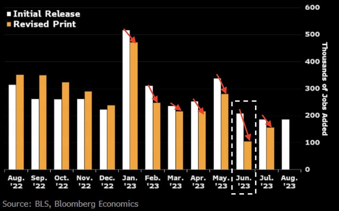 Das ist aber noch nicht alles. Jedes Quartal wird eine zusätzliche QWEC-Prüfung durchgeführt, die wiederum kürzlich zu weiteren Revisionen (-300.000) geführt hat. Diese vierteljährlichen Anpassungen werden jedoch erst im Februar 2024 in den NFP-Bericht für 2023 einfließen.