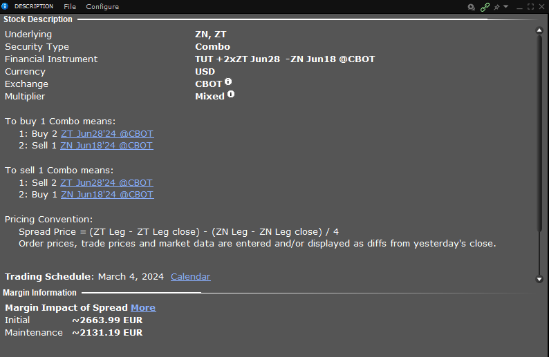 Den Trade sollte man so aufsetzen, dass eine Veränderung um einen Basispunkt in den Renditen der 2-jährigen Anleihen denselben Dollarwert (bekannt als DV01) aufweist wie bei den 10-jährigen Anleihen. Es wird niemals möglich sein, das Verhältnis perfekt einzustellen, da die DV01 nicht statisch sind. Die gängige Konvention besteht jedoch darin, das Doppelte der ZT-Futures zu kaufen und einen ZN-Future zu verkaufen. Für diesen Zweck gibt es bei Interactive Brokers einen eigenen Ticker: TUT. Dieser InterCommodity Spread führt den Steepener Trade aus. Der Kauf eines Kontrakts dieser Kombination bedeutet also, zwei ZT-Futures zu kaufen und einen ZN-Future zu verkaufen.