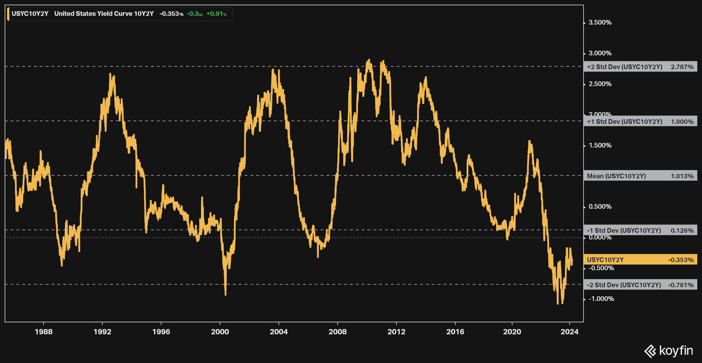 Mit dem Steepener-Trade wettet man ganz einfach darauf, dass die Differenz zwischen den Renditen der 10-jährigen und den 2-jährigen Anleihen wieder positiv wird. Der langfristige Durchschnitt für diesen Spread liegt bei über +100 Basispunkten. Aktuell befinden wir uns jedoch bei negativen 35 Basispunkten.