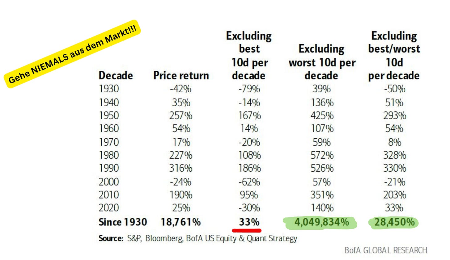 Die Konsequenzen davon, nur wenige sehr gute Handelstage zu verpassen, sind langfristig enorm. Das optimale Ziel sollte es sein, nur ein paar stark negative Tage zu vermeiden, indem man positiv konvexe Strategien nutzt. Diese Strategien bieten ein begrenztes Verlustrisiko, während das Potenzial für Gewinne unbegrenzt ist. Mehr dazu werde ich in einem zukünftigen Beitrag erläutern, besonders wenn sich die Risiken für ein „Hard Landing“ deutlich erhöhen.
