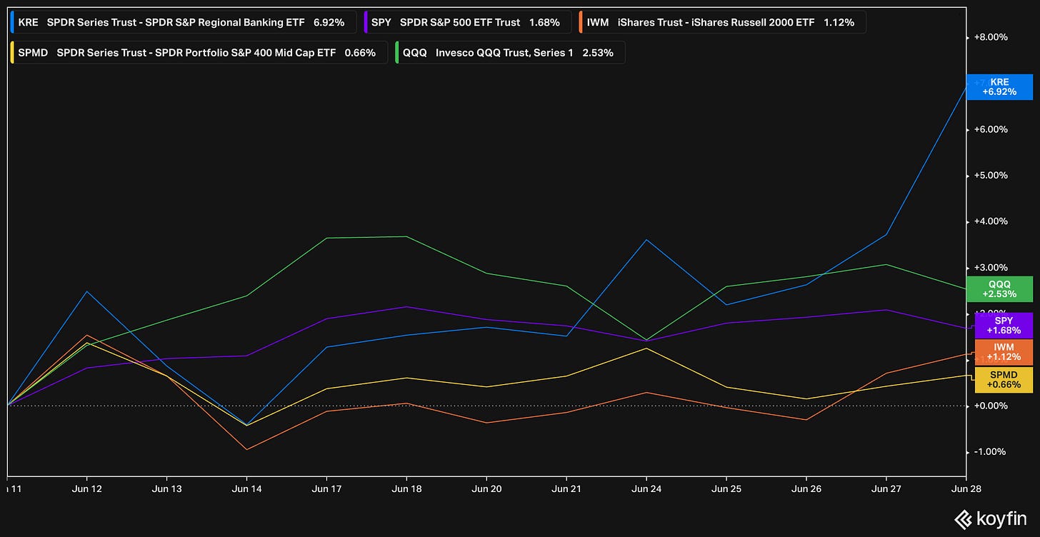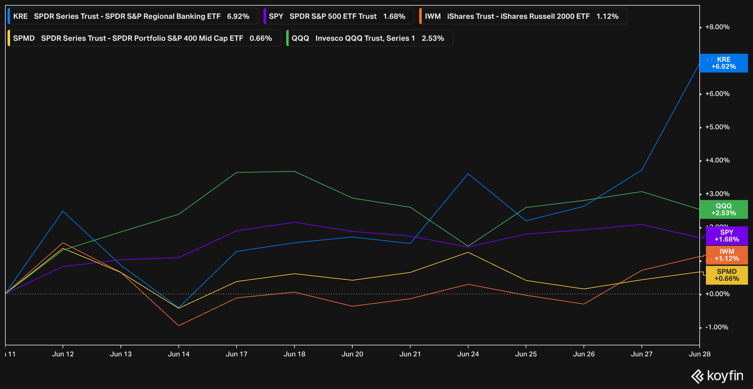 Besonders deutlich wurde dies zuletzt bei den erwähnten Regionalbanken (KRE), die nicht nur den S&P 500, sondern sogar den Nasdaq 100 seitdem deutlich übertroffen haben.
