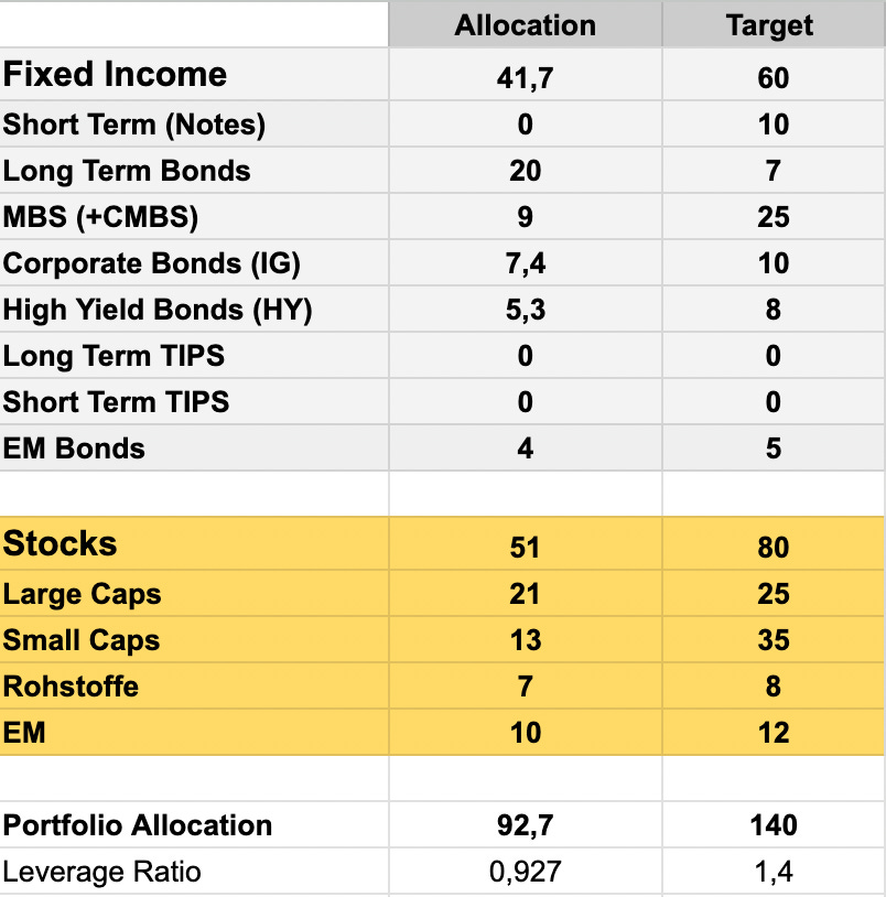 In den letzten Wochen ließ sich mit dieser Strategie die Marktsituation sehr gut überstehen. Die Tabelle zeigt jedoch nur direkte Positionierungen und berücksichtigt keine Optionen oder Futures. Durch den Steepener Trade sind Long-Term Bonds effektiv zu 100% short, während Short-Term Notes um 400% long gegengerechnet sind.