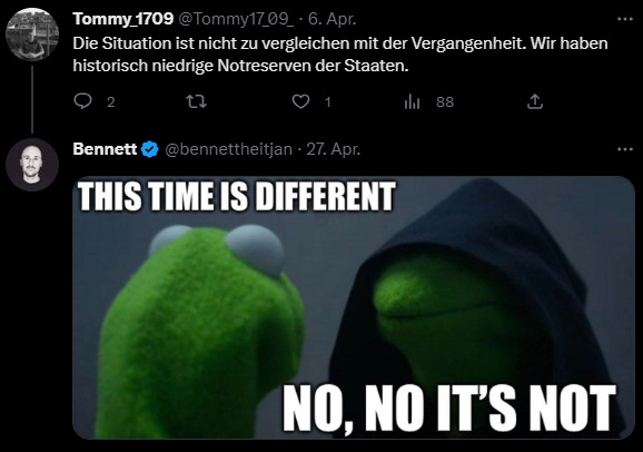 Auch wenn die erste Reaktion des Marktes und die überwiegenden Medienkommentare Produktionskürzungen als ganzheitlich bullish betiteln, darf man die dahinterliegende Botschaft nicht missverstehen. Scheinbar ist die grundlegende Nachfrage eher enttäuschend ausgefallen, vor allem das hoffnungsvoll erwartete China-Reopening! Etwas, was bei dem Blick auf den Ölpreis von Anfang des Jahres bis Mitte März keine Überraschung gewesen sein sollte. Und in einem schwachen Marktumfeld führen, historisch betrachtet, Produktionskürzungen nachhaltig nicht zu einem Preisanstieg.