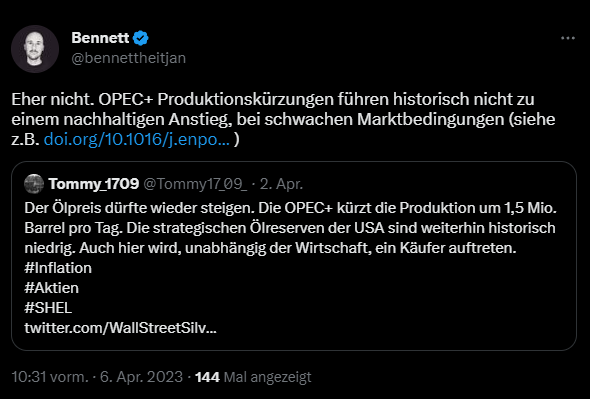 Nach der Ölproduktionskürzung der OPEC+ am 2. April las ich viele Tweets, die darauf hindeuteten, dass der Ölpreis nun, nach den Kürzungen, weiter steigen würde. Eine typische System 1 Annahme, die intuitiv auch nachvollziehbar ist. Wenn weniger Öl produziert wird und das Angebot geringer ist, sollte der Ölpreis steigen.