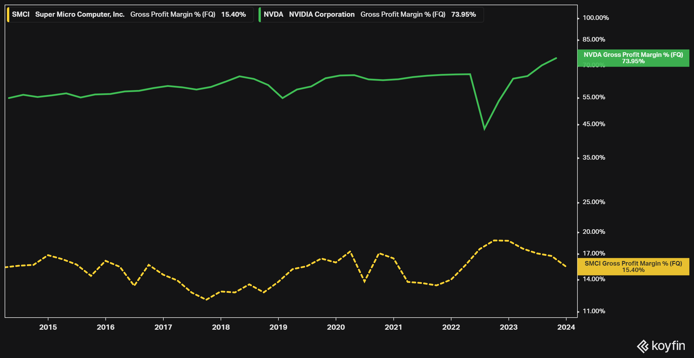 Und der gesamte Prozess kann durch das Ergebnis der Nvidia-Earnings erneut angestoßen (oder beendet) werden. SMCI könnte im März in den S&P 500 aufgenommen werden und einen Aktiensplit durchführen, woraufhin der Zyklus von Neuem beginnt. Diesmal dürften noch mehr Kapitalflüsse hinzukommen, die durch die Indexaufnahme generiert werden. Dabei handelt es sich offensichtlich um eine Blase. Der Anstieg verläuft parabolisch, und die Marktteilnehmer wechseln von einem absoluten zu einem relativen Bewertungsansatz (typisch für eine Blase). Absolut gesehen kann ein Unternehmen schnell als 'teuer' eingestuft werden, aber im Vergleich mit anderen, noch teureren Unternehmen (relativer Bewertungsansatz) lässt sich diese Bewertung leichter rechtfertigen. Die Vergleiche mit Nvidia, die teilweise gezogen werden, sind jedoch völlig absurd. Allein ein Vergleich der Bruttomargen beider Unternehmen lässt bei SMCI Unbehagen aufkommen.