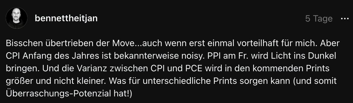 Fast jeder erhofft sich einen Rücksetzer am Markt, doch wenn dieser abrupt und extrem erfolgt und zudem auf Daten (CPI) basiert, die möglicherweise nicht einmal reliabel sind, ist ein solcher Rücksetzer nicht nachhaltig. Nur zwei Tage später wurde die gesamte Bewegung erneut aufgekauft.