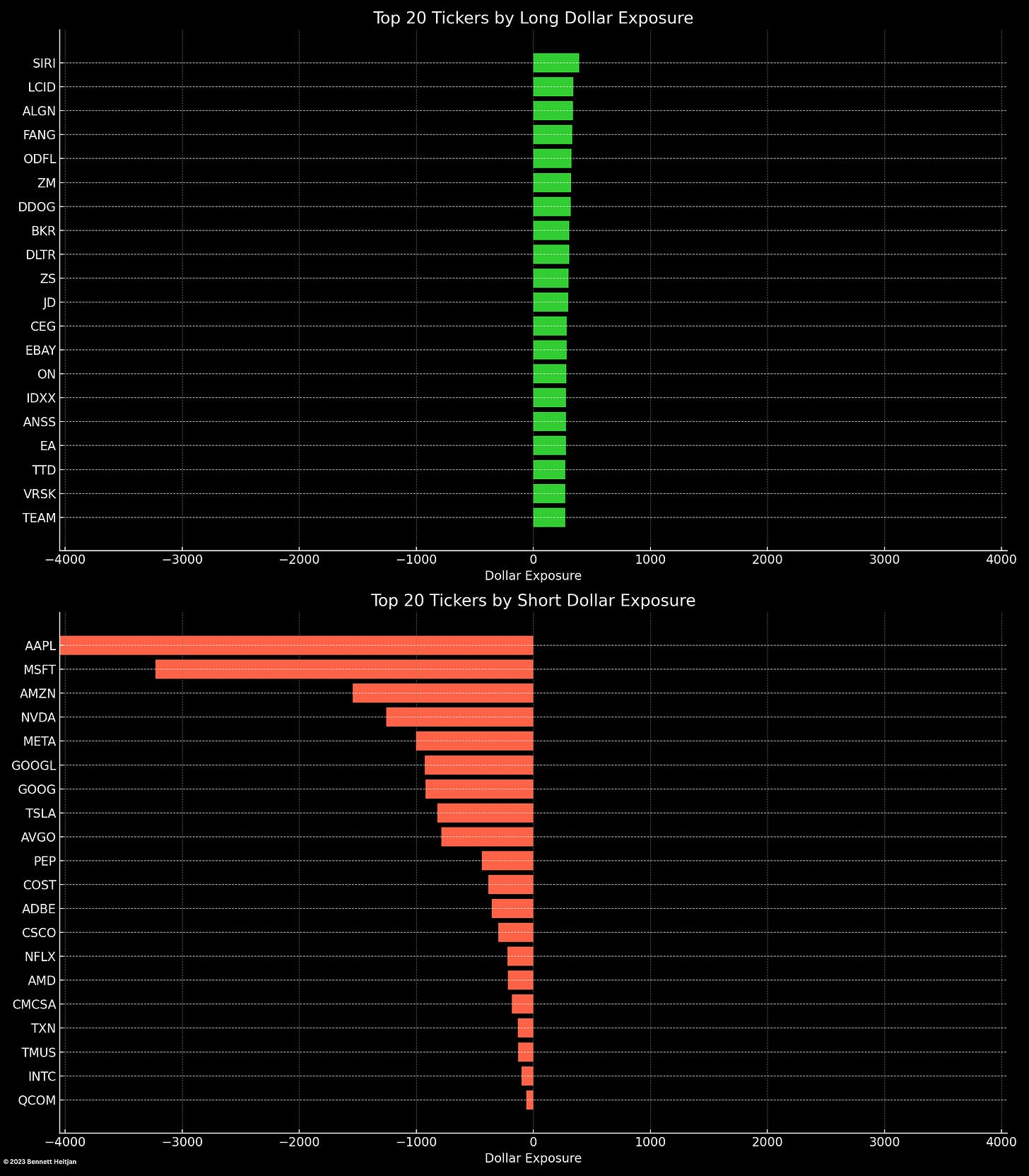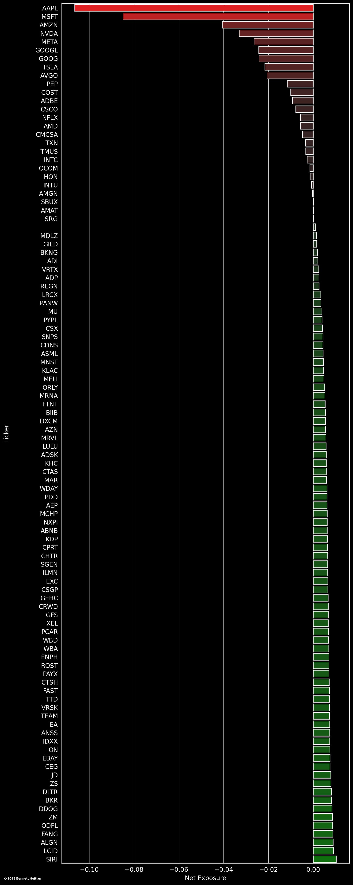 Es ist zudem ratsam, die einzelnen Bestandteile sowie deren Gewichtung bei einer Short-Position im QQQ und einer Long-Position im QQQE genau zu betrachten. Listen dafür sind online verfügbar. Ich verwende oft Koyfin, um die Daten direkt als Excel-Tabelle herunterzuladen und das Netto-Exposure zu berechnen.