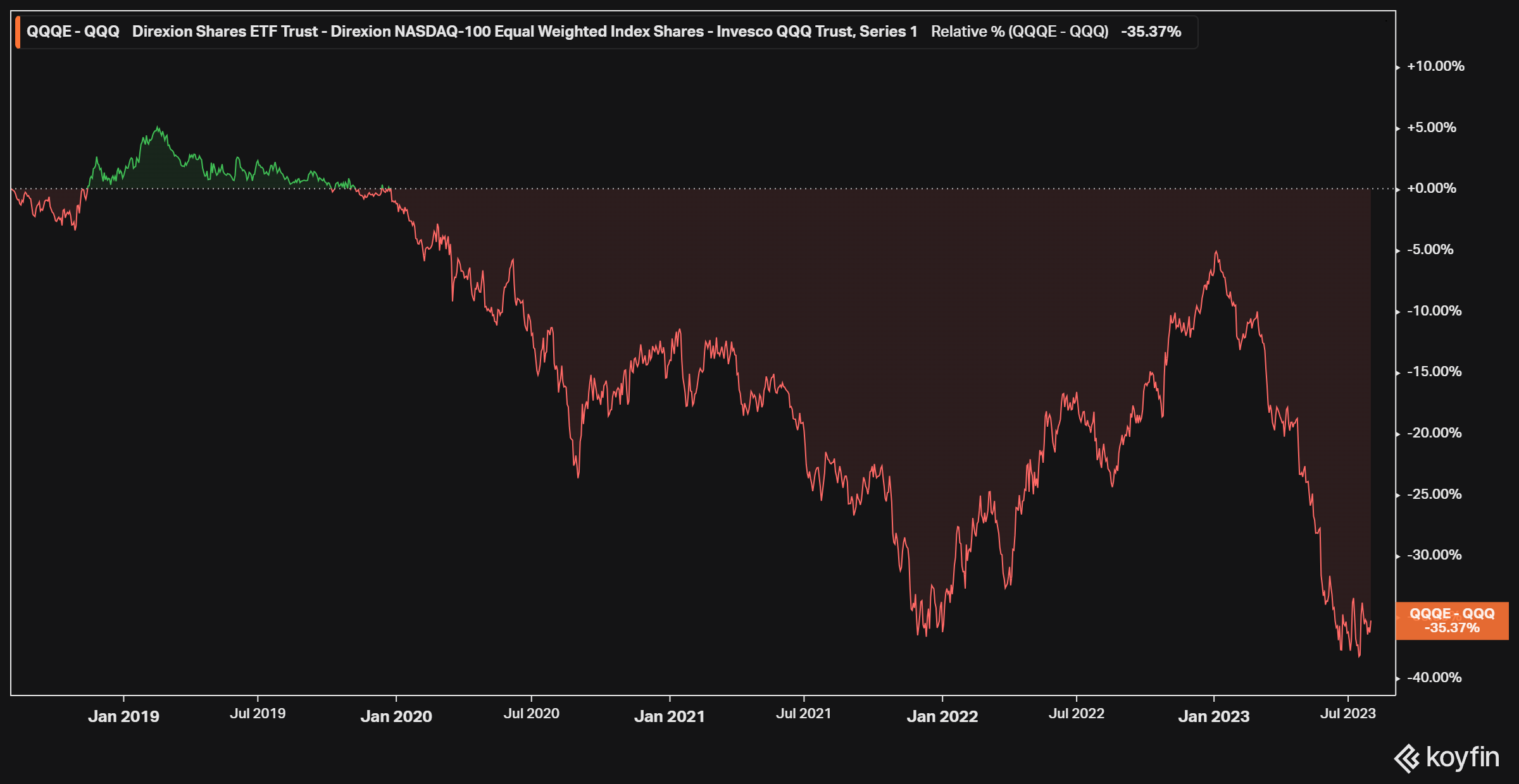 Betrachten wir die jährliche Performance (Stand 2.08.2023): der QQQ-ETF hat um 41,01% zugelegt, während der QQQE-ETF nur um 23,66% gestiegen ist. Der marktgewichtete QQQ-ETF enthält große Unternehmen wie Apple, Microsoft, Amazon und Nvidia die stark vertreten sind. Ihre herausragende Performance in diesem Jahr hat erheblich zur Gesamtperformance des QQQ-ETF beigetragen.