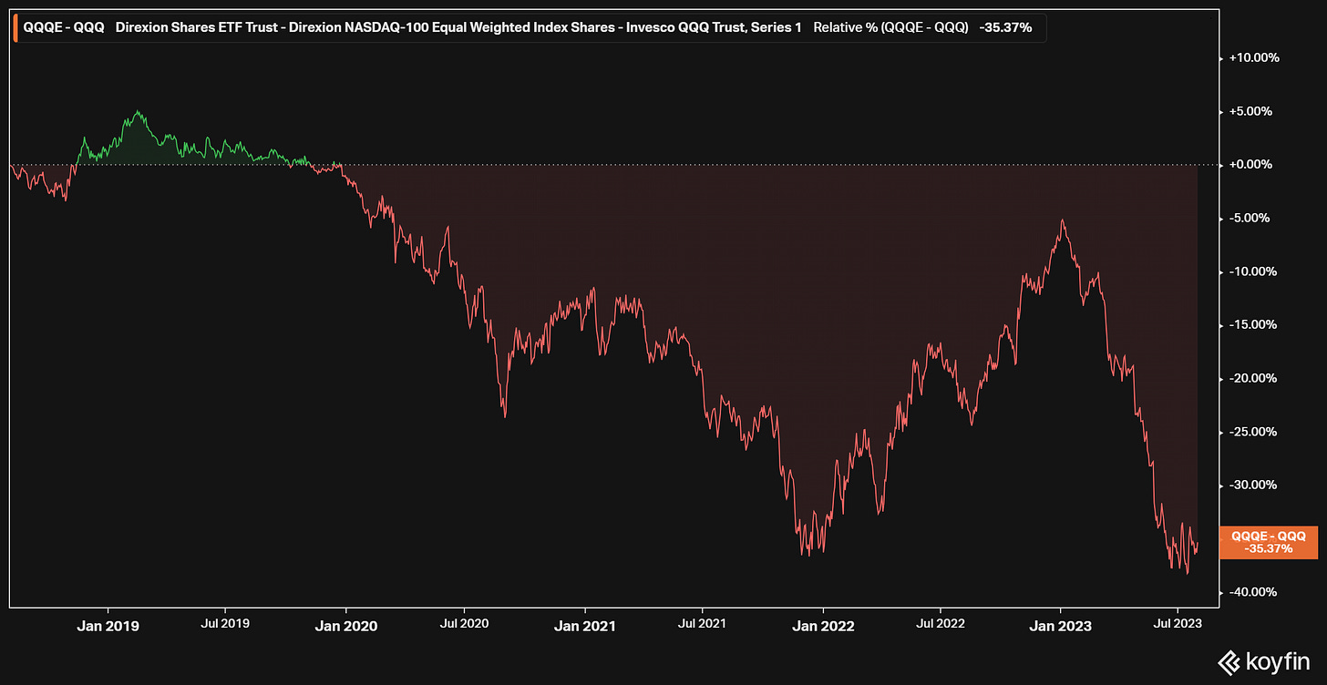 Geht man von 100 Anteilen Short im QQQ aus und nimmt einen Preis von $380 an, ist man mit $38.000 Short und muss denselben Betrag im QQQE Long sein. So ergibt sich eine negative Gewichtung (Short-Position) in den größten Werten, die zudem dieses Jahr eine beachtliche Rendite erzielt haben. Zudem hat man eine Long-Position in allen anderen Werten, die bisher nicht so stark an der Rallye teilnehmen konnten.