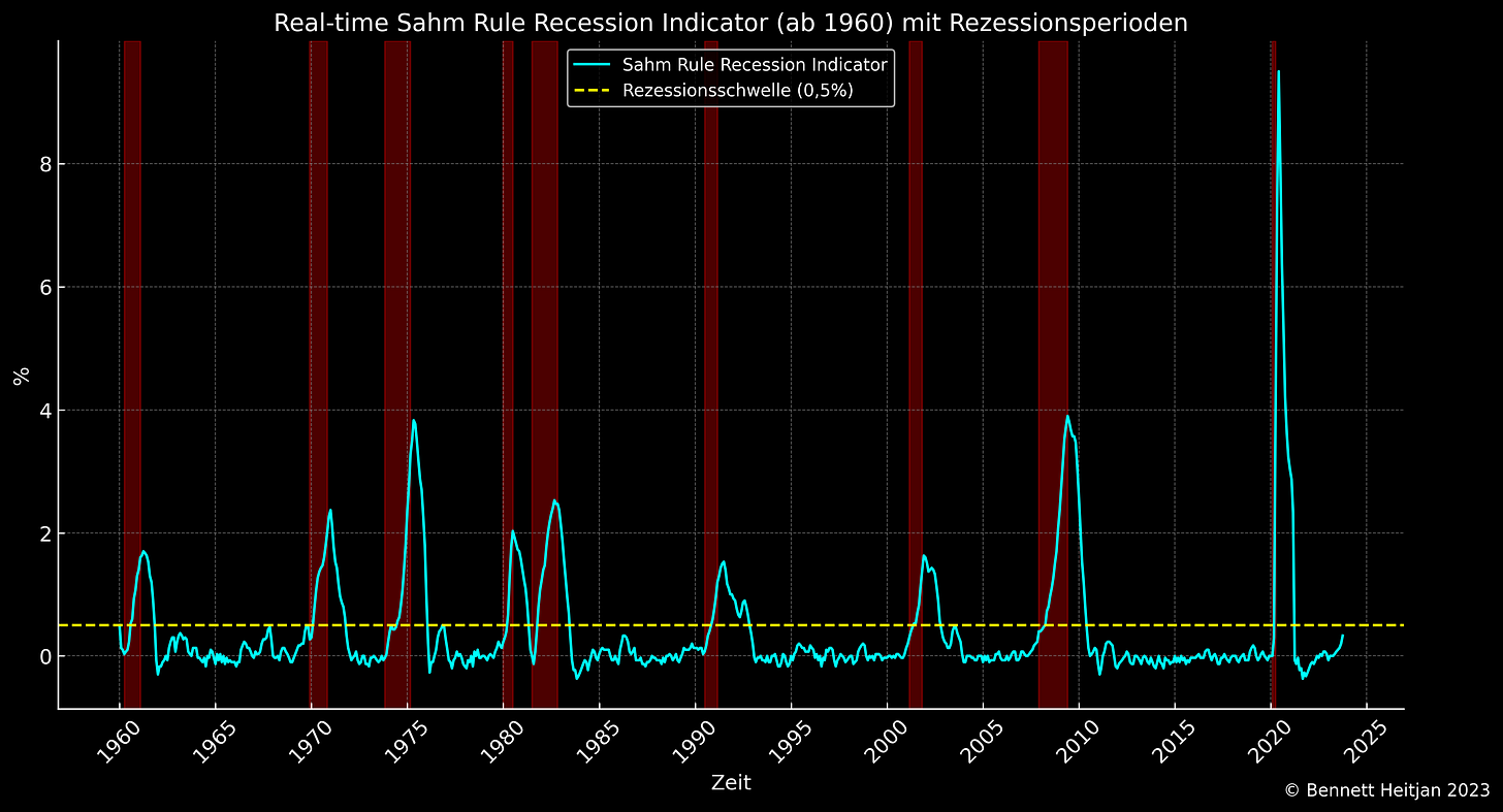 Der "Sahm-Rezessionsindikator" signalisiert den Beginn einer Rezession, wenn der dreimonatige gleitende Durchschnitt der nationalen Arbeitslosenquote (U3) um 0,50 Prozentpunkte oder mehr im Vergleich zum Minimum der dreimonatigen Durchschnitte der vorangegangenen 12 Monate ansteigt.