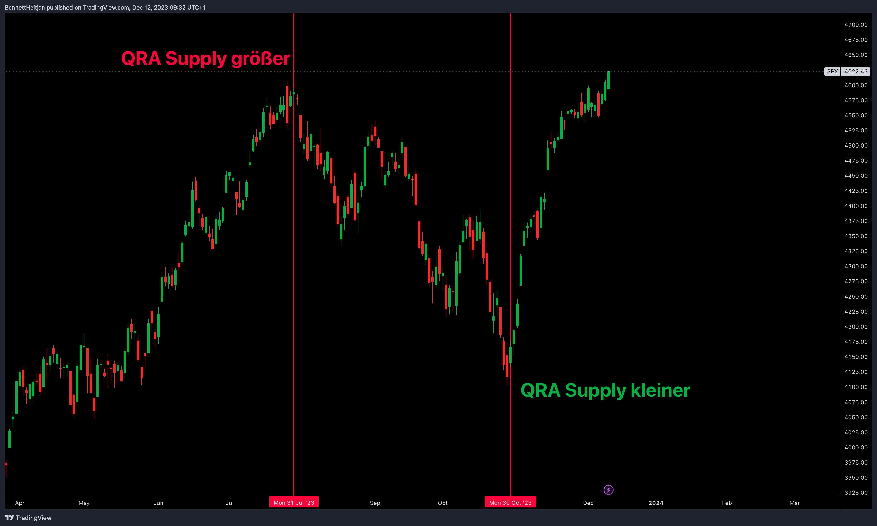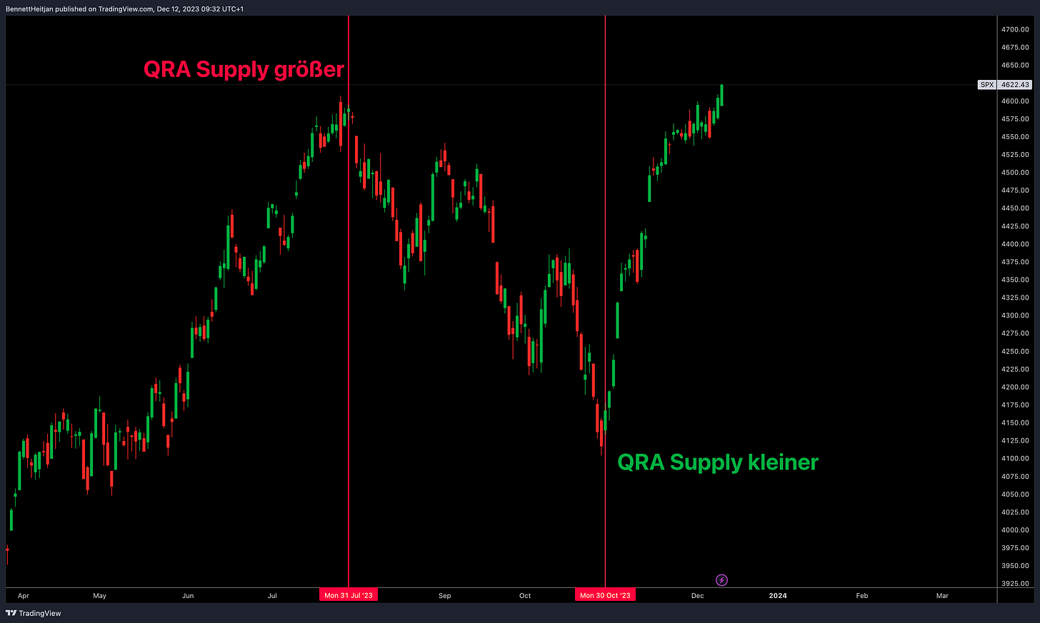 Die größten Bewegungen im S&P 500, QQQ, TLT im Jahr 2023 wurde unteranderem stark durch das QRA Supply Update angeführt. Im letzten Blog Artikel bin ich vor dem letzten QRA Update intensiv auf die Entscheidungsdynamik eingegangen: