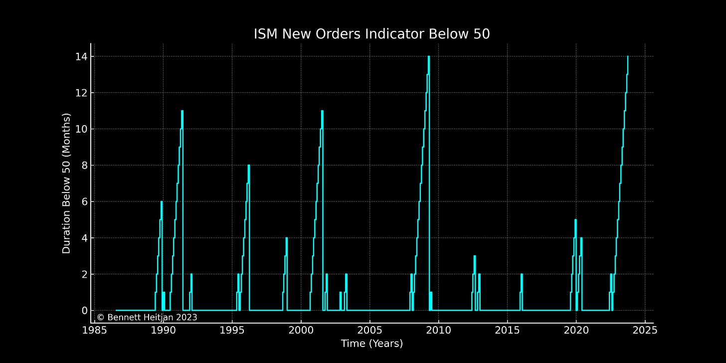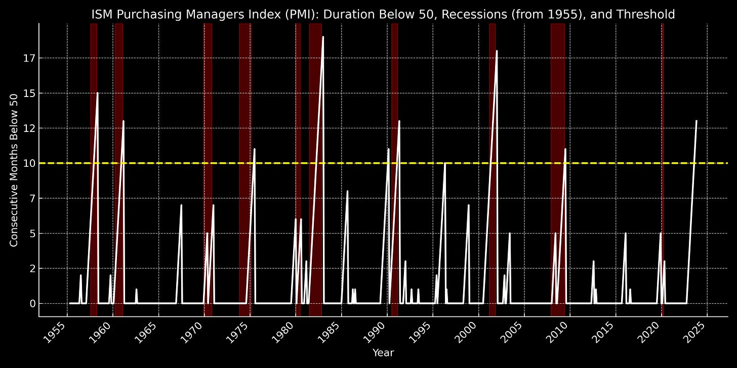 Noch aussagekräftiger als die einzelnen Komponenten ist der gesamte PMI-Index, der alle fünf Sektoren umfasst: Neuaufträge, Produktion, Beschäftigung, Lieferzeiten der Zulieferer und Lagerbestände. Dieser Index befindet sich nun seit 13 Monaten in Folge in einer Kontraktionsphase. Historisch gesehen trat 'immer' eine Rezession ein, wenn der PMI-Index mehr als zehn Monate in Folge eine Kontraktion aufwies.