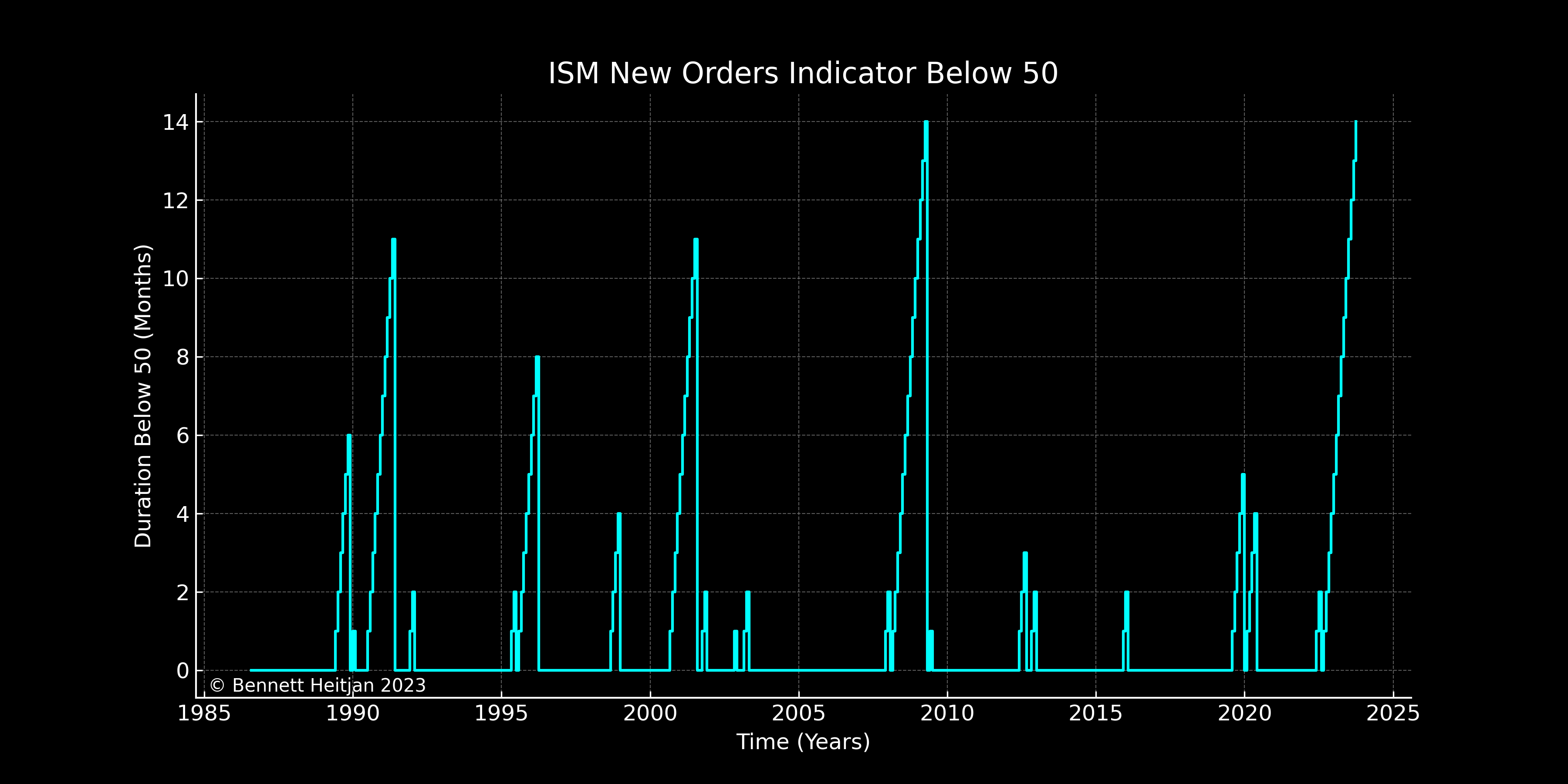 Diese Dynamik spiegelt sich auch in fast allen anderen weichen Daten wider, wie die vom Institute for Supply Management veröffentlichten Zahlen zeigen. Ein Beispiel hierfür ist die Komponente 'neue Aufträge' des Indexes. Dieser Indikator, der die Anzahl neuer Aufträge im verarbeitenden Gewerbe während des Betrachtungsmonats misst, befindet sich nun seit 14 Monaten kontinuierlich unter 50, was eine Kontraktionsphase anzeigt.