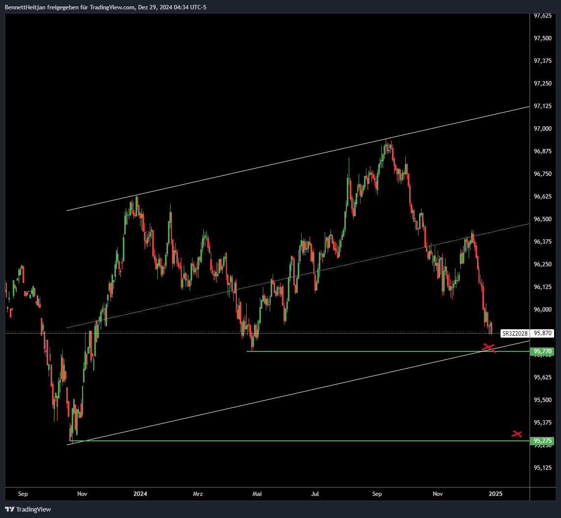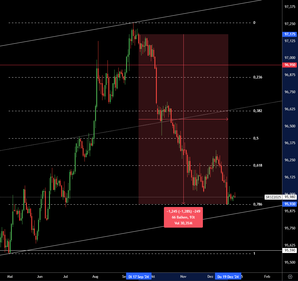 Aber zurück zum spannenderen Thema: "Alpha". Aktuell hat man die Qual der Wahl. Schon die kleinste Schwäche in der US-Wirtschaft (oder das Ausbleiben einer sehr starken wirtschaftlichen Entwicklung) wird zu einer schnellen Neubewertung der Zinserwartungen führen. Rein technisch betrachtet würde ich nahe der Marke von 95,770 im SR3Z2028 eine Long-Position eingehen, jedoch mit einem engen Stopp. Ein Verlust dieses ersten Supports wäre wahrscheinlich die Folge eines überraschend starken Arbeitsmarktberichts am kommenden Freitag. In diesem Fall würde ich erst wieder in der Nähe von 95,50 eine Long-Position aufbauen.