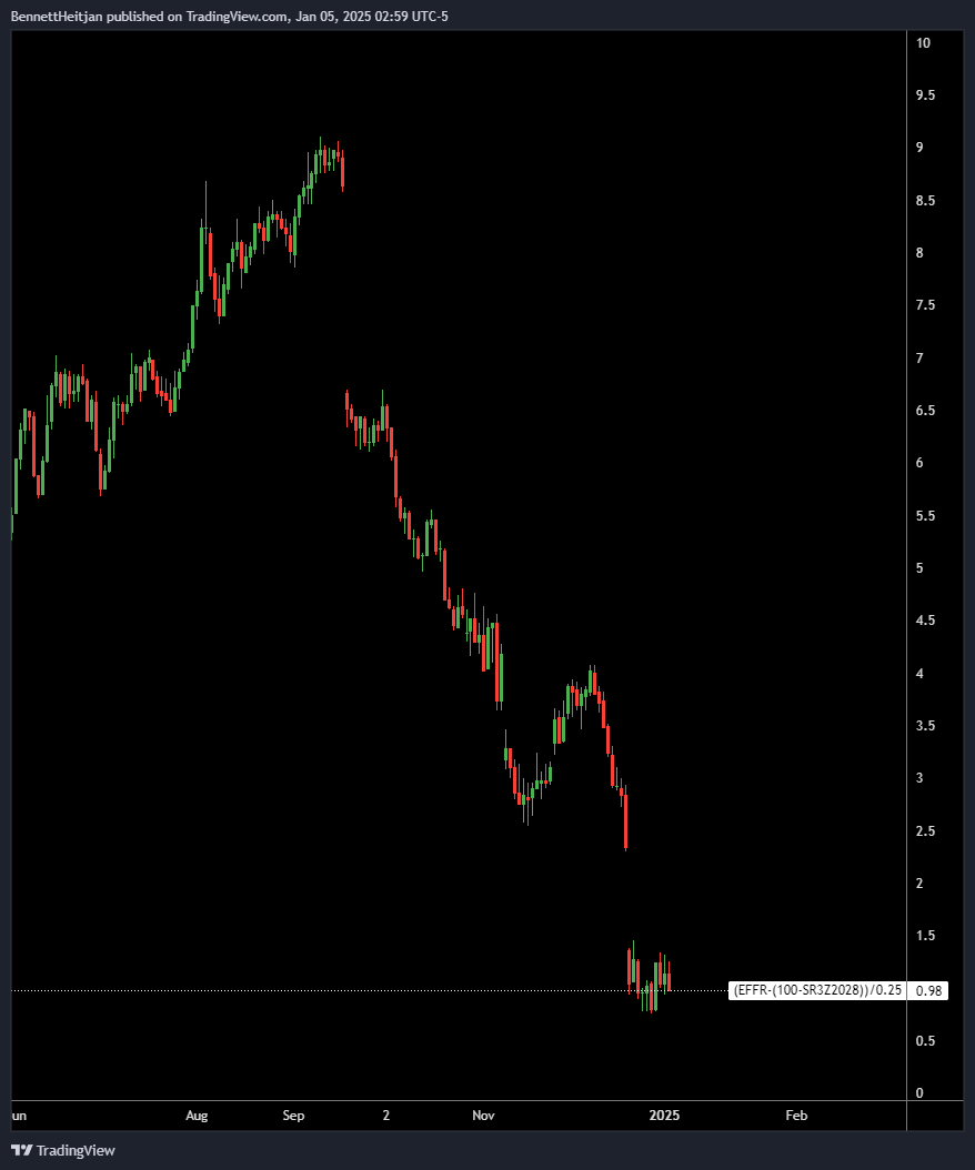 Mitte September waren unglaubliche 10 (!!!) Zinssenkungen bis Ende 2025 eingepreist (3x 25 BPS Zinssenkungen kamen danach (1x 50 BPS und 1x 25 BPS) - was wiederum die EFFR ändert). Rückblickend (aber auch damals) war das natürlich überzogen, was sich im Nachhinein als super logisch erweist. Aktuell sind bis Ende 2025 knapp über eine (genau 1,38) Zinskürzungen eingepreist. Noch bemerkenswerter: Bis Ende 2028 ist weniger als eine einzige Zinskürzung eingepreist (0,98).