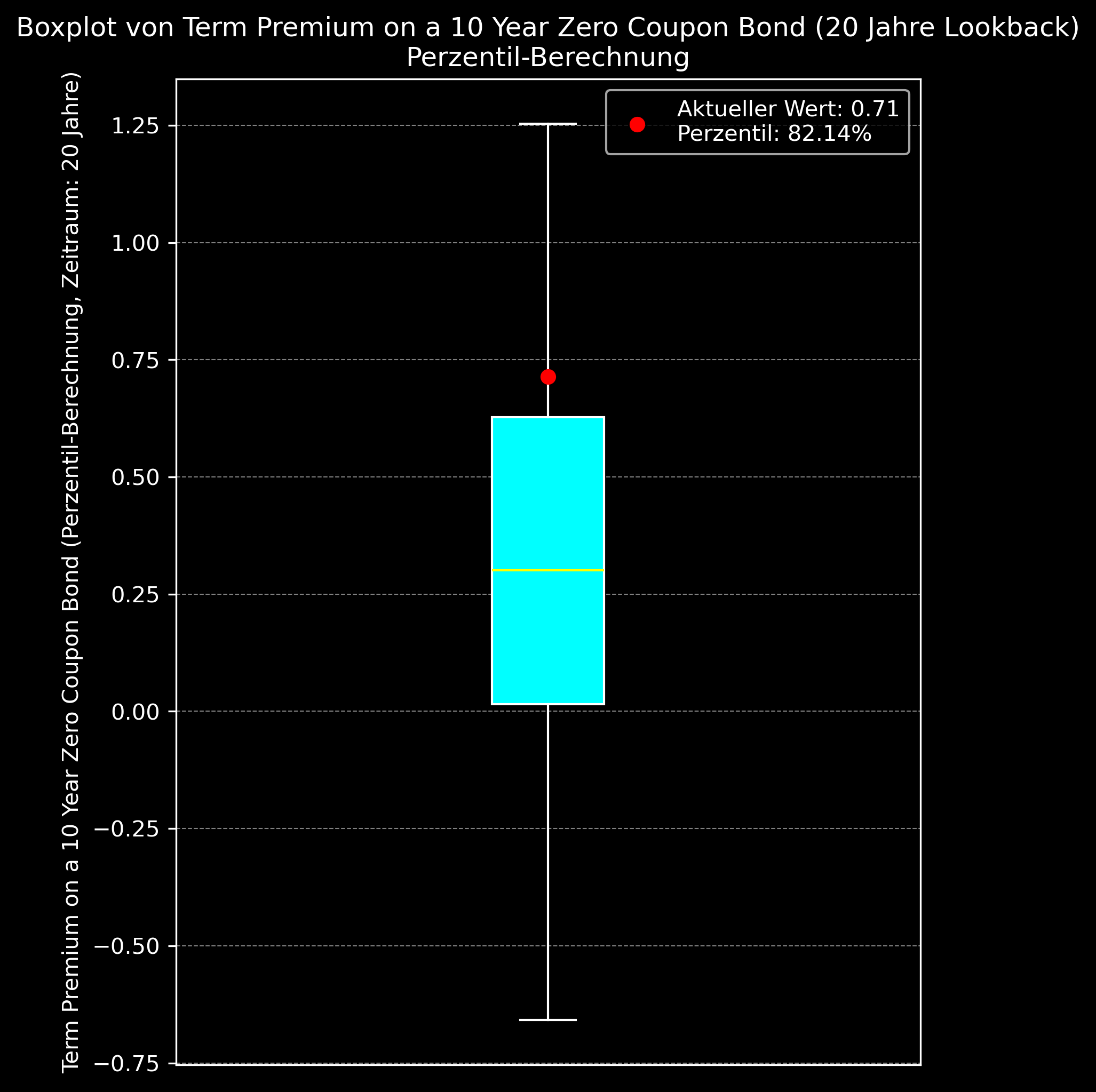 Seit meinen Warnungen hat sich jedoch viel verändert. Eine Warnung bei einer Rendite von knapp 4,9 % auf 20-jährige Staatsanleihen würde ich aktuell nicht unbedingt aussprechen. Das Term Premium (der Risikoaufschlag für länger laufende Anleihen im Vergleich zu kurzlaufenden) befindet sich mittlerweile auf dem 100% Perzentil im 10-Jahres-Vergleich – also auf dem höchsten Stand seit einem Jahrzehnt und auf dem 82,14% Perzentil im 20-Jahres-Vergleich.