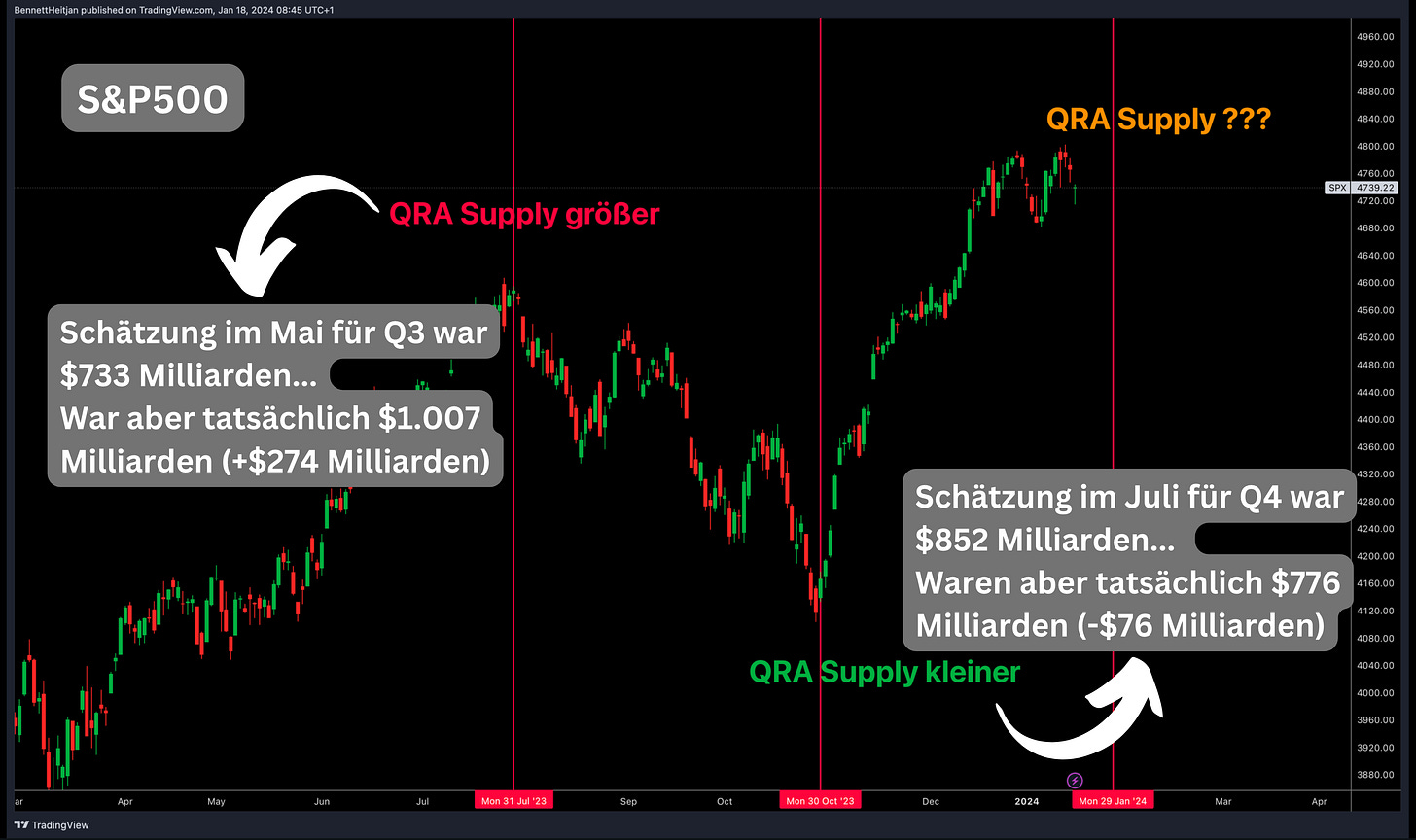 Die letzte leicht negative Veränderung im QRA und damit in den Liquiditätsbedingungen gab es Ende Juli 2023. Diese führte zu einer 11% Korrektur im S&P 500. Genau am Tiefpunkt lenkte Janet Yellen um (durch eine Reduktion der Laufzeiten) und sorgte seither dafür, dass die Liquiditätsbedingungen weiterhin günstig blieben. Der anschließende Verlauf des S&P 500 ist Geschichte.