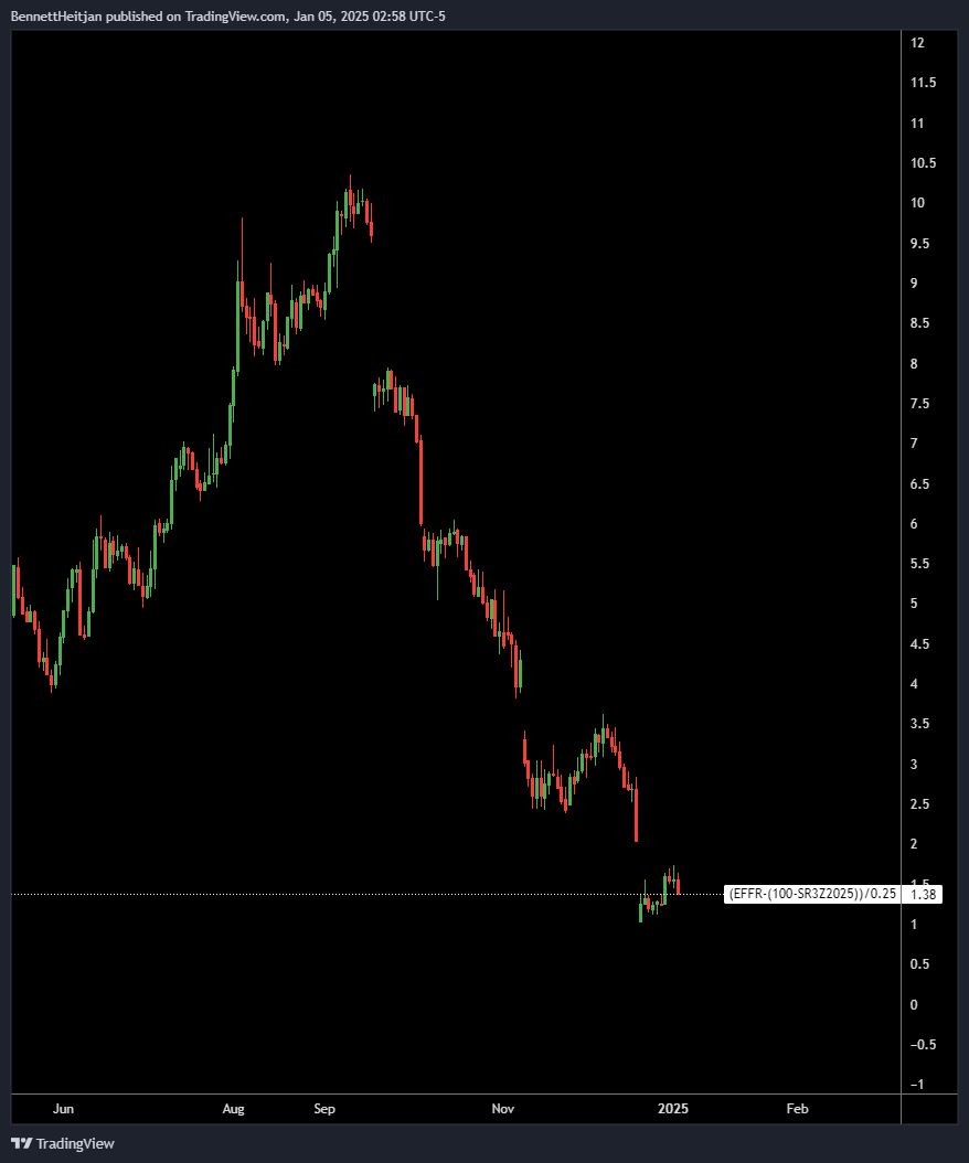 Im letzten Blogpost haben wir die massive Divergenz zwischen makroökonomischen Daten und der Einpreisung über STIR (Short-Term Interest Rate Futures) analysiert. Dabei sind wir zu dem Schluss gekommen, dass zu viele Zinskürzungen eingepreist waren. Die praktischste und effizienteste Umsetzung bestand, wie dargestellt, darin, SR3Z2025 zu shorten. Seitdem wurden bis heute knapp 125 Basispunkte (entspricht fünf vollständigen Zinskürzungen bis Ende 2025) ausgepreist.