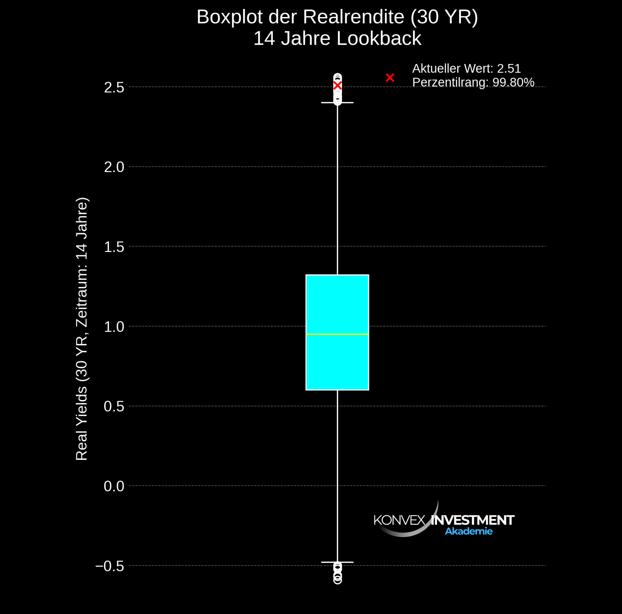 Realrenditen von 30-jährigen Anleihen befinden sich aktuell im 99,8% Perzentilrang (14-Jahres-Rückblick)